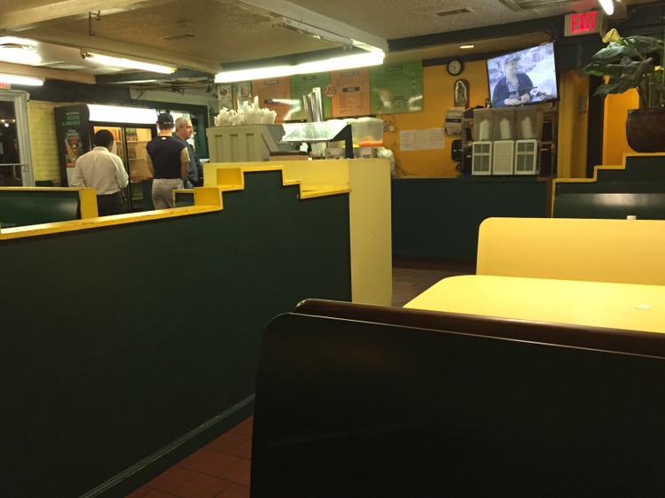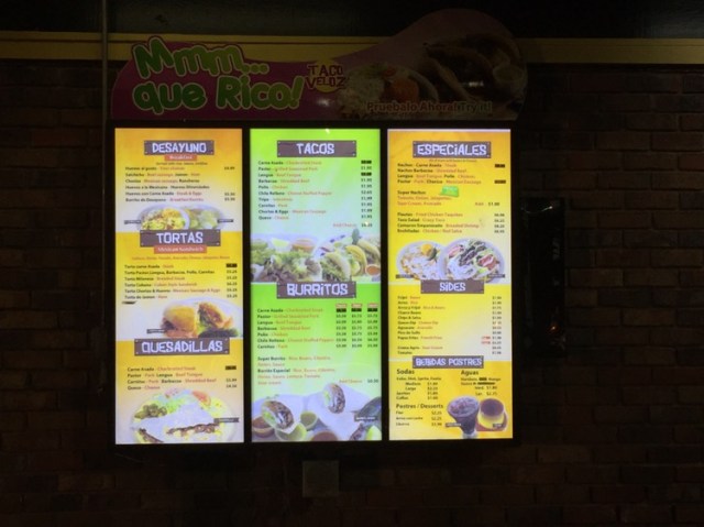Looking for a quick bite on Thursday as I headed around the top-end perimeter, I jumped off at Roswell Road, certain I’d find something. And I did – local chain El Taco Veloz. They have five locations in the metro area and one in Gainesville. Just south of 285, this location is near the Target, underneath the running taco sign above. I arrived about 6:30and it was fairly empty (as you can see below), so I studied the menu above the counter and contemplated my choice.