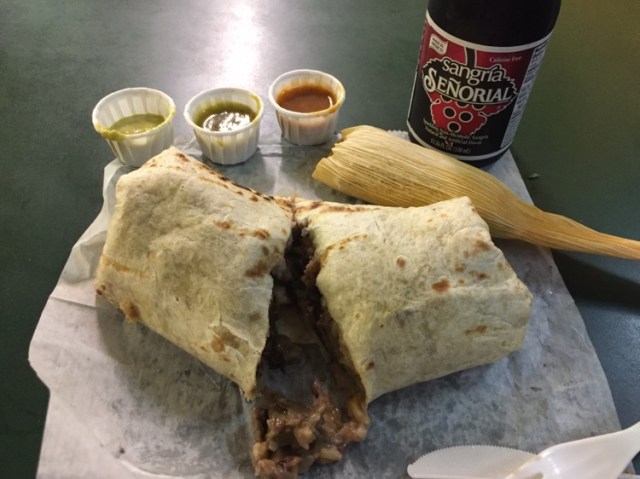 With most every kind of meat you could want – barbacoa (shredded beef), lengua (beef tongue), chicken, pastor-style pork, chorizo and carne asada (grilled steak). I settled on a carne asada burrito especial, with no lettuce, and a chicken tamale.