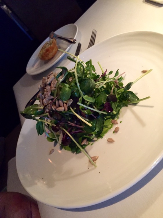 which was composed of Vonnie’s sunflower shoots, pea sprouts, radish sprouts, house made buttermilk ricotta fill, black pepper and toasted sunflower seeds. We asked our server if the salads and appetizers were shareable and he said they were not, but this salad was definitely large enough to split. Because it was full of sprouts, we did not have to share it. I was told that it was glorious and the plate was cleaned. Instead of a salad, I chose the lightly cured yellowtail hiramasa.
