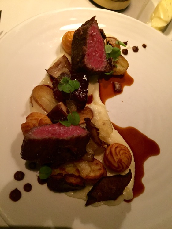 The beef, which was a melt-in-your-mouth perfect medium, was served with four kinds of potatoes (whipped, dauphine, small chips and thin steak fries) and shiitake mushrooms. The one piece of wagyu in the middle was braised (they serve it in one of the appetizers – a potato dumpling) and it was fine, but the grilled bites were exceptional. The whipped potatoes were phenomenally sweet – when we asked what made them so special, we were told that they boiled the potatoes down as long as possible to garner as much flavor as possible.