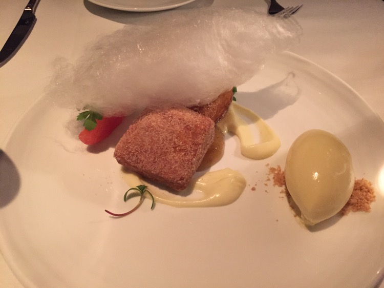 This was apple beignets, popcorn ice cream and vanilla-lemon custard, topped with cotton candy. The flavors definitely hearken you to the Midway, but I think we would have possibly enjoyed a more traditional dessert more.