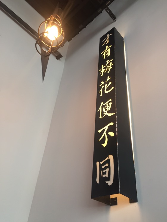 Located in the Trader Joe’s parking lot, at the corner of Monroe and Virginia, the first thing we knew was parking would be a challenge. Because parking is always a challenge in that parking lot. The decor is very clean and modern, and over each of the tables along the wall are these metal shades which the owner had custom ordered with phrases he had chosen on them.