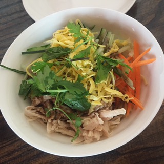 ed with a cold noodle dish, full of cilantro and shredded chicken. My beloved does not care for cold noodle dishes, so I had this one to myself. I noticed the large amount of cilantro on top, and set that aside for the other side of the table – she really likes cilantro. I really don’t. The dish was good, but I wouldn’t order it on a return visit. Note: if you want a fork, you need to ask as the standard table ware is chopsticks. Our other