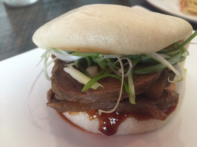 Next came the sandwiches (baos). I’ve always thought of baos as Asian, but never as, particularly, Chinese. But I found that in Chinese, “bao” generally refers to baozi – a steamed or baked bun filled with (most often) meat. I had a beef shank bao, with chili hoisin sauce.