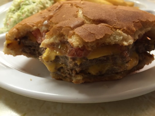 After looking around at our dining companions, the guy next to me had a burger on grilled white bread, which looked excellent, like a grilled cheese with a beef patty on it. But I had chose a double cheeseburger plate.
