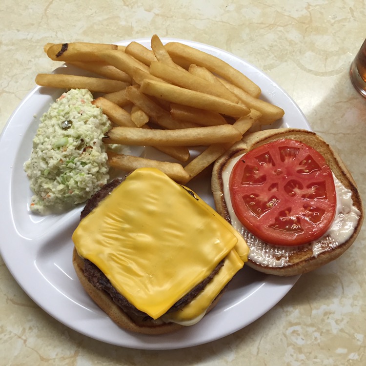 After looking around at our dining companions, the guy next to me had a burger on grilled white bread, which looked excellent, like a grilled cheese with a beef patty on it. But I had chose a double cheeseburger plate.