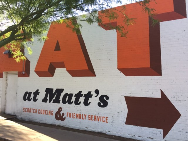 Matt’s has three locations (the place mat pictures each of the  restaurants, and a coffee shop, and says, “This is a place mat.  These are Matt’s places.”), including one in Terminal B at Sky Harbor airport.  The only complaint I could lodge with the breakfast that we had here was that we felt very rushed:  the check appeared less than half-way through our meals; they came back to pick it up well before we were finished eating; and they tried to take our plates before we were through.  I guess that’s how they serve so many people.