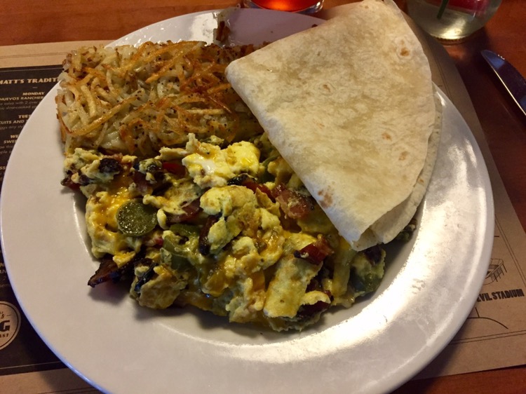 For me, it was the Saturday special – a scramble, today’s being made with fresh jalapenos, bacon and four eggs, served with a warm tortilla and hash browns.