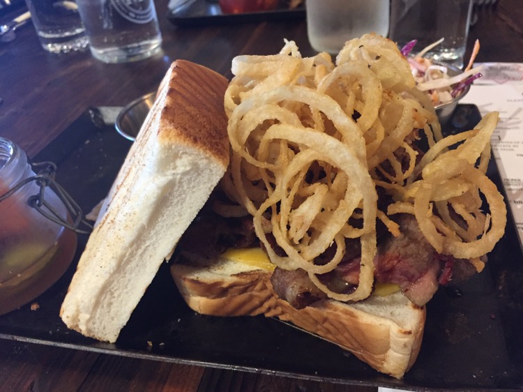 This was a tasty burger, served with crispy house cut fries and (oddly) a crock of pickled vegetables. I passed the pickles across the table to my host, who was having the brick-pressed chicken panini. On my second visit, I had the brisket sandwich, with crispy onion rings, slaw and (again) the crock of pickled vegetables.