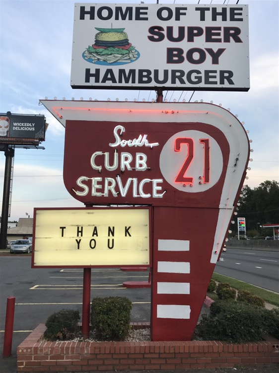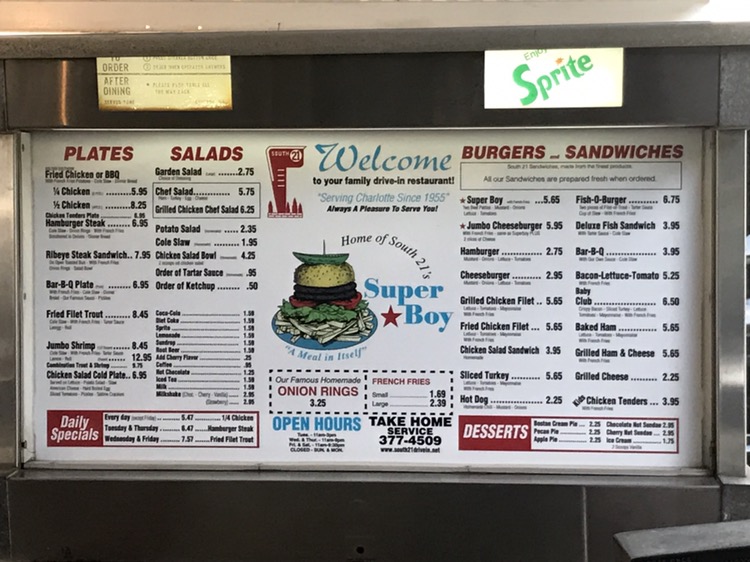 Going back to the original Hamburger America list, as we were driving through Charlotte this evening we swung into South 21 for a quick dinner. “Swung in” is a bit of an understatement as it involved an exit, a u-turn and a return onto a divided six-lane highway, but you get the idea.