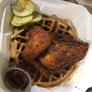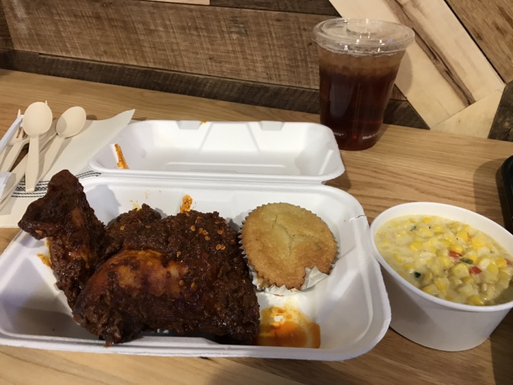 This was good (kind of) hot chicken, but the highest heat level here only hits medium at a good Nashville hot chicken place. The skin was crisp and the chicken underneath was moist. The corn had jalapenos in it and had almost as much heat as the chicken. The corn muffin, as opposed to traditional white bread, was a pleasant surprise and just slightly sweet.