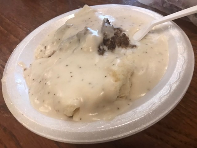 which I enjoyed. It had large chunks of sausage and the gravy was good. The biscuit underneath was fairly flaky. I also discovered “Hotter” Texas Pete’s Hot Sauce, on the table, which I put on my biscuit. And I’ve been looking for it in the stores ever since – to put it in our fridge.