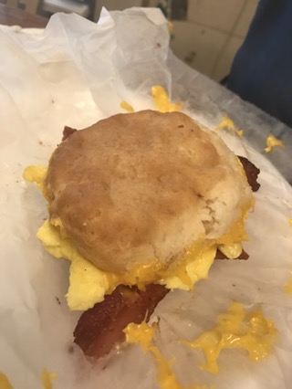 The bacon was thick (which better suited me than her – luckily, I had ordered a side of bacon – she likes bacon thin and crispy) and her biscuit was not thick and flaky. It was like the biscuits had been made by a different person.