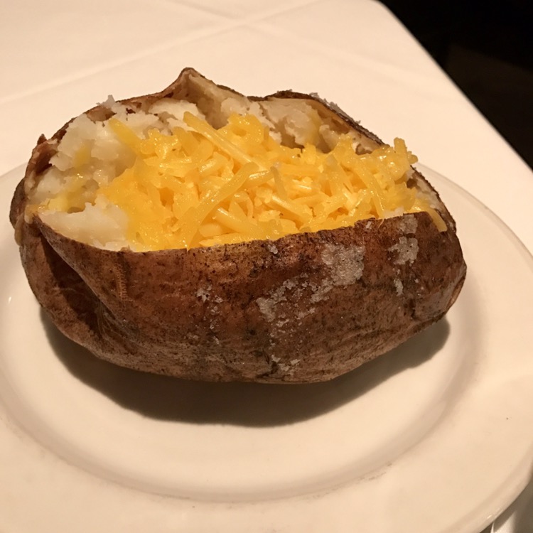 A potato that doesn’t arrive to the table so hot that you can’t eat it, at a French steak house, seems to be a faux pas.  It barley melted the cheese and butter.   It arrived alongside the steak.