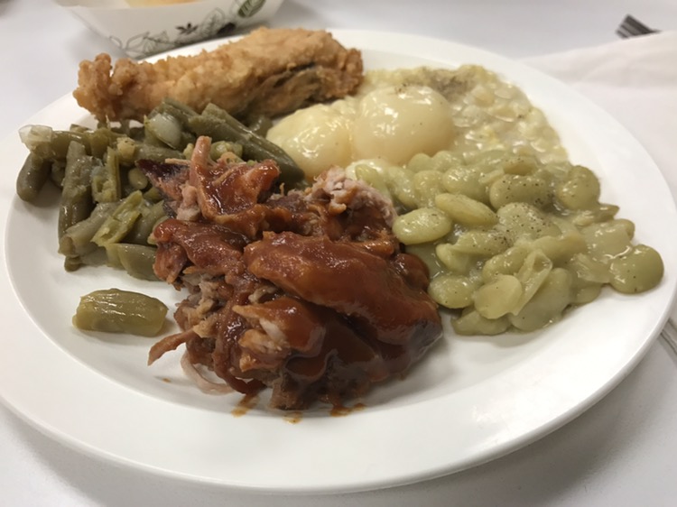 You can see the assortment of food in the picture above: fried chicken (which they’re known for), BBQ pork, stewed tomatoes, boiled potatoes, cream style corn, lima beans, green beans, cole slaw, rolls and corn bread and peach cobbler.