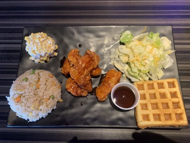 The chicken had a crispy skin that shattered when you put a fork to it. I chose a half chicken on this first visit. The onion rings, potato chips and corn salad were an odd side for breakfast. I’ve been back a couple of times, since this first visit, and the sides with the chicken & waffles have morphed and most recently include “cold cheese corn” (that’s what it now says on the menu), some REALLY well done fried rice and a salad.
