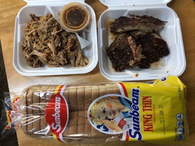 Remembering that we had a cooler in the trunk, we ordered a pound of pulled pork, a half pound of ribs and picked up a loaf of Sun Beam white bread.