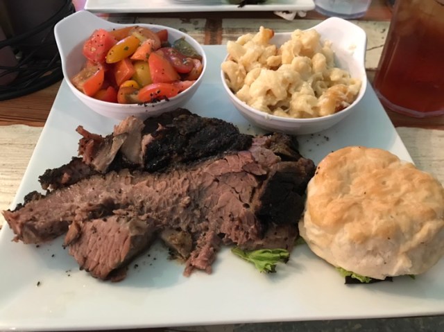 The brisket was moist and fork tender and there was plenty of it on the plate. The tomatoes were at their nearing-end-of-summer peak and made for a bowl of sweetness mixed with tartness. The mac-n-cheese was creamy and almost too hot to eat. And there was a house-made biscuit. What was not to like? I’ll be looking for a chance to return.