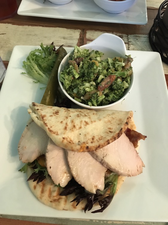 The menu is fairly varied, with broad sections – snacks / salads / entrees / barbecue sandwiches and “naan-wiches”. There is a focus on barbecue from their smoker and there were four kinds of sauce on the table (I liked the Hot Mama Vinegar and Colonel Mustard – with the brisket, in my belly). My lunch date had one of the naan wiches (an open faced sandwich on naan bread), served with a side. She chose the smoked turkey, with aged cheddar and bacon and the broccoli salad.