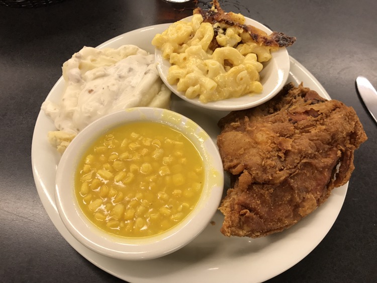 This diner began in the fifties and still uses the original counter and stools as the front of their dining room. It is a meat and three, in the most classic of senses, filled with locals and with caricatures of some of the regulars on the wall. I ordered fried chicken, mac-n-cheese, mashed potatoes and white gravy and butter beans.