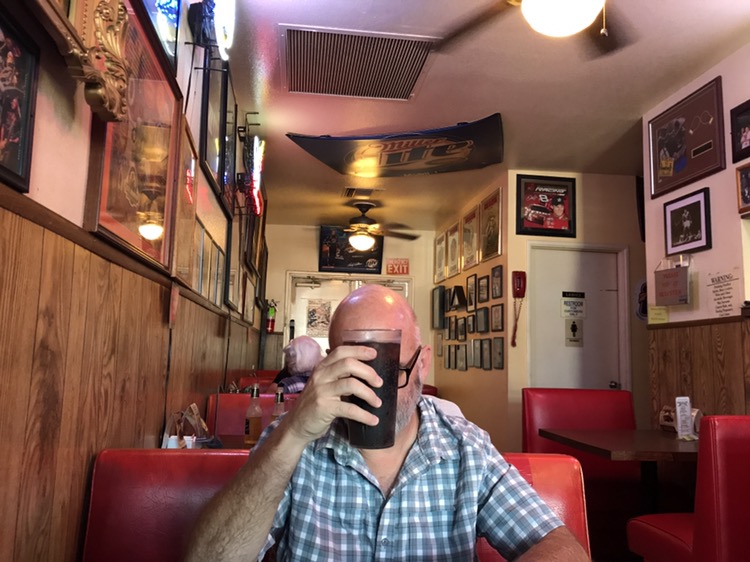 I found George’s Bar & Grill (World Famous Burgers & Insults) on the Hamburger America app, as we rolled into Palm Springs. It was 4:45 and the app said they closed at 5:30, so we drove eastward. I should have taken it as a sign when we arrived at 4:55 to find the “Closed” sign up and a note on the door that they were observing summer hours (11:00-3:00).