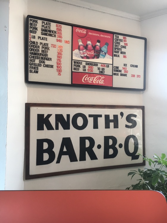 We took a seat in the front room, behind the pig in the first photo. Knoth’s is a classic style barbecue joint, open for more than 50 years and run by the son of the original owner since 1975, that gained a degree of notoriety when Jay Leno discovered them on a hunting trip and mentioned them several times on the Tonight Show. We had eaten lunch already and would be having dinner before long, so we looked at the menu to decide on mid-afternoon snack.