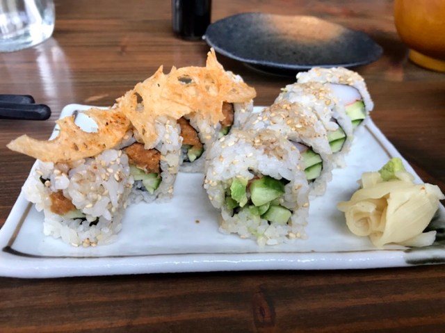 The flavor of this soup was multi-layered, without an overwhelming fishiness. As executive chef Jason Liang is known for two things: the quality of his ingredients and his sushi, we started with rolls. We went the New World roll route – they had several choices here, along with Old World (more traditional Japanese) rolls – and each ordered a half roll: crunchy tuna (left) and Snow Crab California (right).