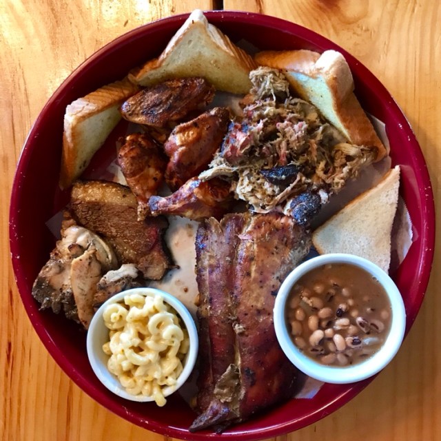 Reviewing the menu, we ordered the Whole Farm: 1/4 pound each of chicken, pulled pork and brisket, plus a half rack of ribs and five smoked wings. We added a side each – mac-n-cheese and black eyed peas (with onions and bacon).