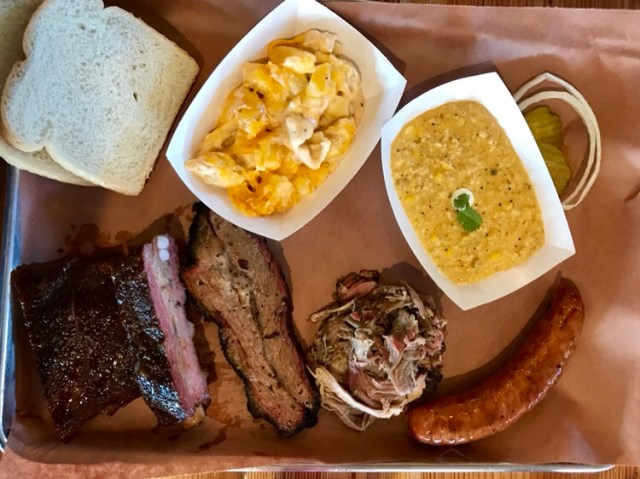 ribs, brisket, pulled pork and (spicy) sausage (basically, everything but the foul), with mac-n-cheese and elote creamed corn. The meats were all cooked perfectly (part of the uniformity comes from a process that starts meats on Pancho or Lefty and then moves them to a gas powered Southern Pride smoker), all initially smoked on hickory and pecan. The sausage (from Meyer’s Smokehouse, again, in Texas) was a little greasy, but very tasty with good spice. And, of the two sauces on the table, I really liked the “Georgia Yellow Peach”, which features pureed peaches and cane syrup that they grind and cook at their family farm in Stillmore. The creamed corn was very good and very spicy.