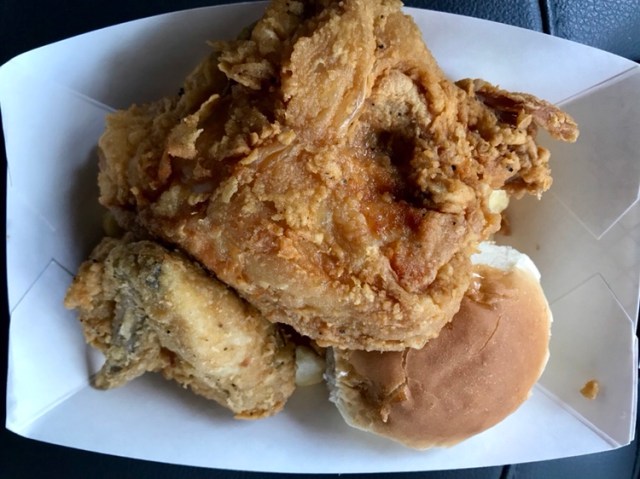 Roaming the wilds of east Georgia, we’d been going from small town to smaller town, working our way through antique, thrift and junk stores. Our lunch destination was the metropolis of Washington. Georgia. We were heading to the Big Chick – a takeaway fried chicken place, serving breakfast, lunch and dinner since 1980, that I heard about on Garden n’ Gun’s Fried Chicken Bucket List. Served in a paper tray in a brown paper bag, I ordered two piece (which came with a roll) and a side of corn balls.