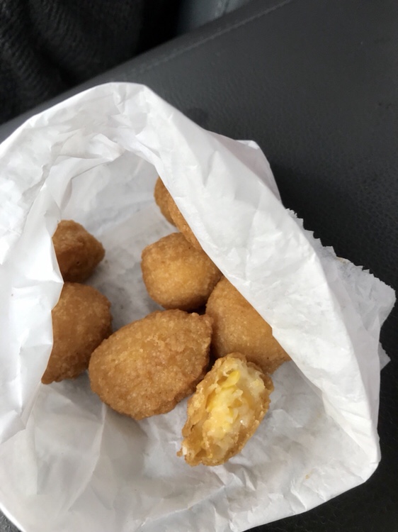 The chicken was cooked to order, so we sat on the tailgate in the parking lot for about 15 minutes and watched the people come and go. Across age and color lines, everybody seemed to be coming to the Big Chick. The skin was crispy, the chicken was tender and moist and it was seasoned perfectly. And that wing? I would go back for chicken wings. We ordered the corn balls, after reading about them on yelp – battered and fried scoops of whole kernel corn, in little nuggets.