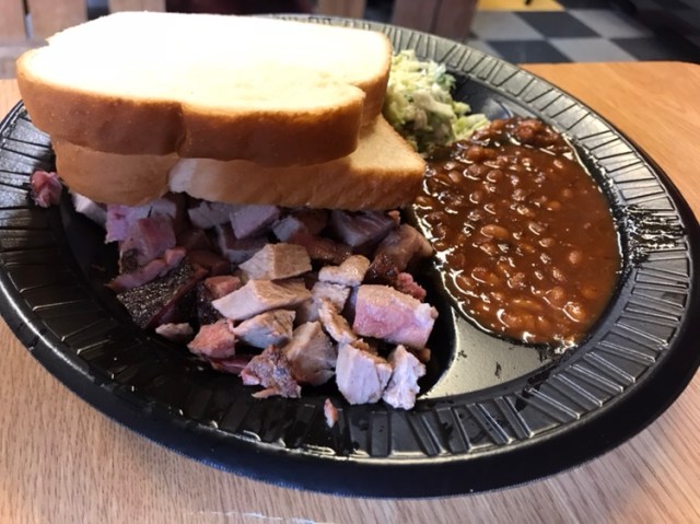 Chopped pork platter, with baked beans and cole slaw. Note chopped and chipped differ.
