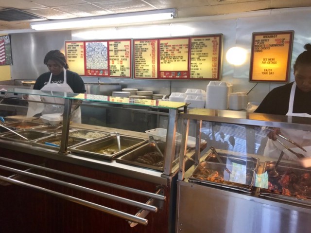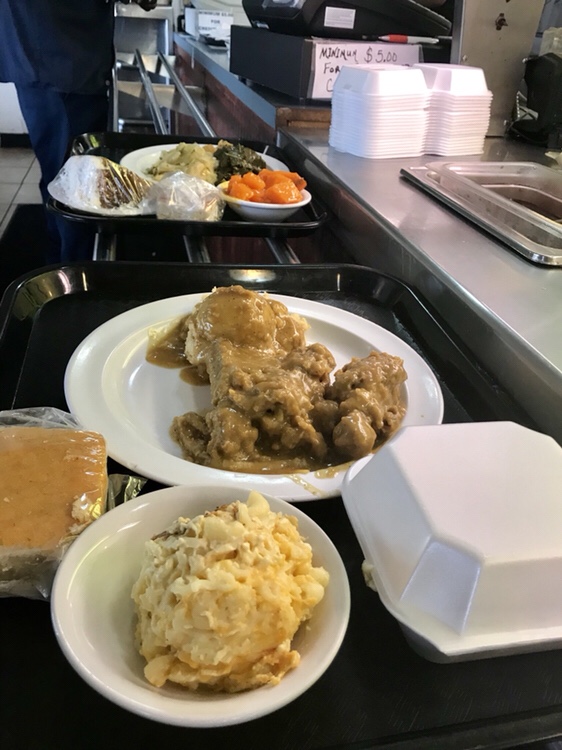 They had a steam table, the length of the restaurant, with meats (fried chicken, ribs, smothered chicken, hamburger steak and baked chicken and a couple more) and eight or nine vegetables, followed by desserts and a salad condiment bar. Note that I did not include a hyphen in salad-condiment bar, because it wasn’t a salad and condiment bar – it was items you’d find on a salad bar, sold as condiments (a slice of tomato, sliced jalapeños, etc). That did come in handy when my beloved asked for pepper sauce for her greens – they dipped a to-go cup in the sauce for the peppers and put a lid on it for her.