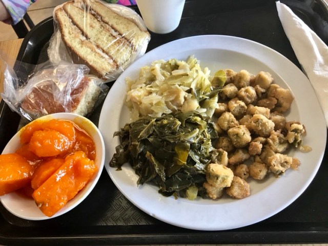 My dear wife went with a vegetable plate – greens, fried okra, steamed cabbage and sweet potatoes. She said the okra was great and enjoyed the cabbage, a lot. The sweet potatoes were just average and the greens were a little sweet, but with that pepper sauce and the cornbread crumbled up in it, she enjoyed the greens, thoroughly. And that coconut cake? She had part with lunch, a little in the car and the rest before bed.