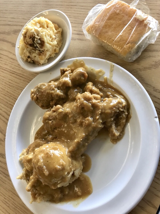 I was leaning toward the fried chicken, but the smothered fried chicken lured me away. I had mac-n-cheese and cornbread dressing as my two sides. Given the choice, I had the gravy from the smothered chicken on the dressing. The mac-n-cheese was a little sweet, but tasty, but the cornbread dressing was the best dressing I’ve had since my mom’s cooking, back in her glory days. I kept seeing this fork creep across the table and grabbing a forkful of dressing…