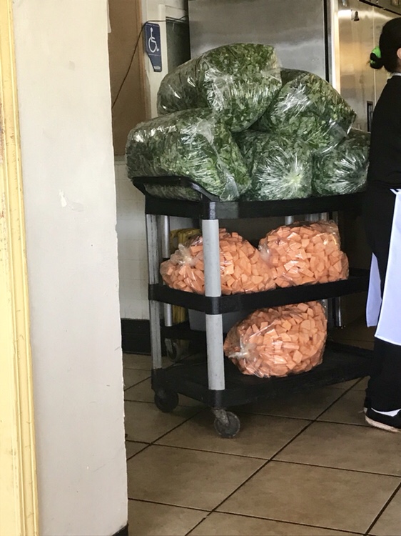 I stepped into the mens’ room to wash my hand and when I got back to the start of the line, my beloved said, “did you see their score?” It was above 65 (my floor), so we went ahead and entered the cafeteria line. We could see, in the kitchen, the bags of greens and sweet potatoes.