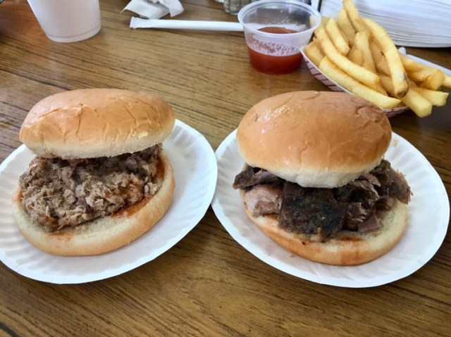 Based on the conversations occurring with the tables around us, the staff has been here forever, and knows most of the customers by name. Piedmont style barbecue is, definitely, it’s own thing and you either like it, or you don’t. Chopped pork (often minced – like in the sandwich on the left below), served with a water-like vinegary sauce with pepper flakes in it. I’m on the fence about it, in general, although I am a big fan of the sauce.
