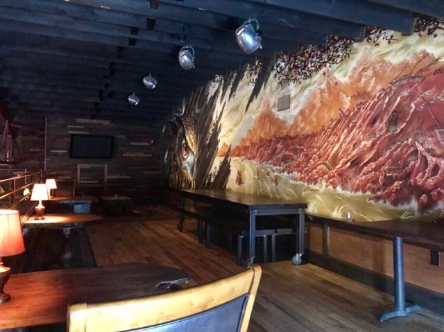 The gastro pub, with plenty of seating on the main floor, also has a massive bar, serving drinks until 2:00 nightly. There is also a raised tier on the street side (where we were seated), a second story of seats along the right side and the loft area (pictured below) over the brick oven in the picture above. The loft is dominated by a huge mural of an owl that looks onto a coast, perhaps reflecting the original definition of an argosy – a large merchant ship. The wood, everywhere, is redolent of large sailing ships.