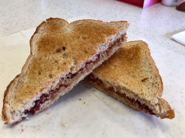 The menu is mainly burgers and hot dogs (the chili dog billboard lured me in), but my beloved was drawn to the toasted peanut butter and jelly. Yep – a childhood classic, served on toasted white bread. The only thing missing is your mom to cut the crusts off…