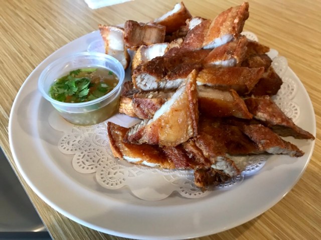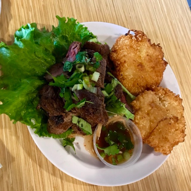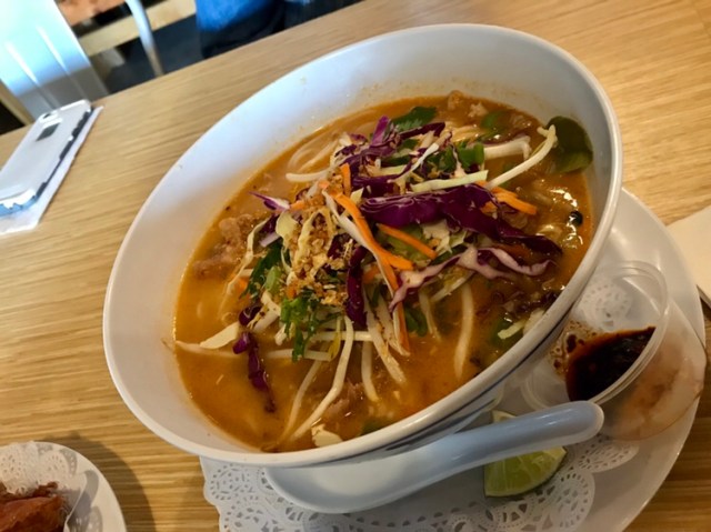 House-made rice flour tapioca noodle with chicken; garnished with beansprouts, scallions, cilantro and fried garlic