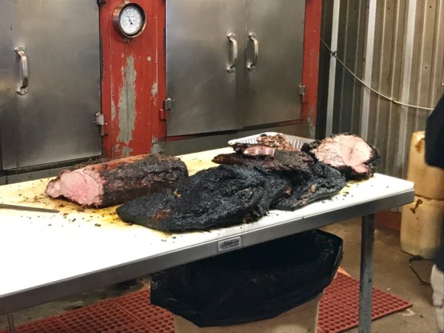 The parking was an indication of the crowd, and after two parties ordered in front of me, I had a clear shot at the head of the line. Check out the brisket, prime rib and separate shoulder clod (the leaner part of the brisket), on the cutting table (in the back middle, above, and featured, below).