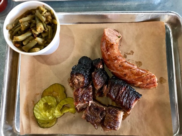 First thing – they really need to do something about the chips. They were, very much, like round Tostitos, straight out of the bag. And the queso, under the brisket, was extremely generic. It’s basically ball-park nacho cheese on a bag of Tostitos, topped with brisket, for $7.00. The brisket was good, with nice bark and flavor, but the nachos didn’t do it any favors. At all. For lunch, I ordered a combo plate with burnt ends and a cheddar-jalapeno sausage (second one in two days), with a side of green beans.