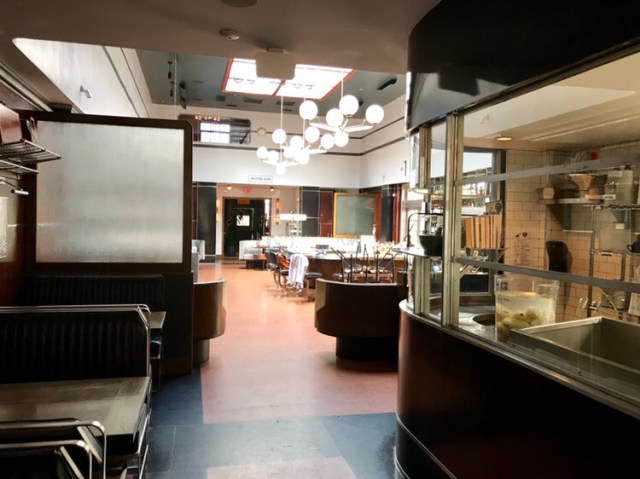 The picture above is exiting the diner / bar up front and looking into the main dining room (the former terminal). From the other end (below) you can see the fantastic lines of the space, with the departure doors still numbered on the courtyard wall.