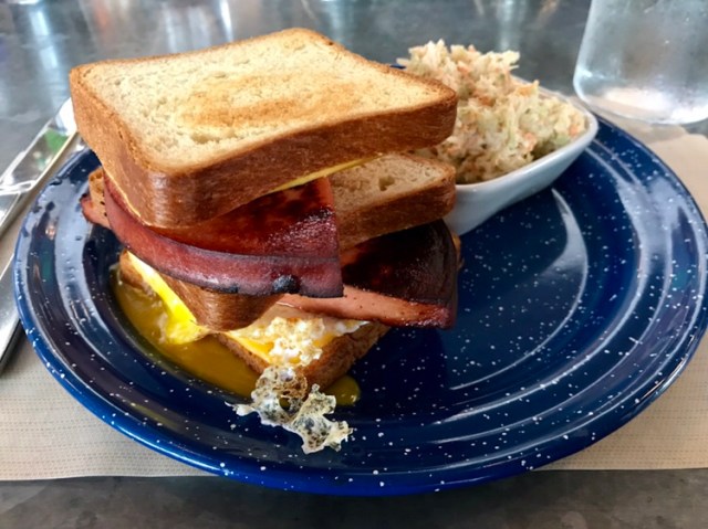 We shared this dish and it was very cheesy, but it could have used a more flavorful cheese to add more “oomph”. On to the blue plate special – a thick-cut fried balogna sandwich, on house-made bread, with cheese and a fried egg with a choice of side. I went with the slaw as a side, for my beloved, as I intended to eat more than my half of the mac-n-cheese.