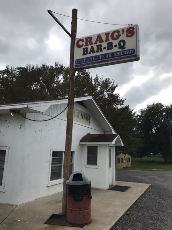 Heading west, we had been driving on I-40 for a while, when a barbecue stop was necessitated. Based on two references, over three or four years, from Garden ‘n Gun, we took the exit towards Devalls Bluff, Arkansas. As we approached the white sign for Craig’s Bar-B-Q, it looked like my kind of place. Middle of nowhere. Gravel parking lot. A couple of trucks on the side. We parked the trailer in the church parking lot next door and walked over for a mid-afternoon barbecue snack.