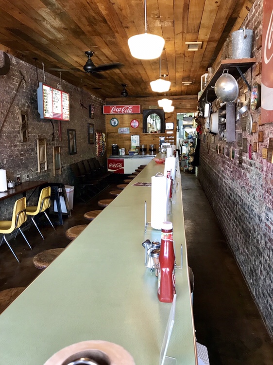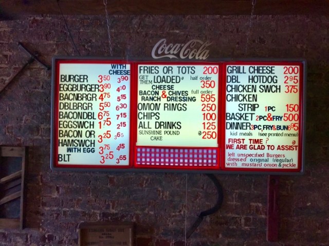 Yep, the interior brick walls are the exterior walls of the neighboring buildings.  We had a nice visit – and the place to ourselves, after a carry out order was picked up – with the owner.  She gave us the history of the families that had owned it down through her – she purchased it from Vicki Latham last year.  But she said that Ms. Latham still comes in on Saturday to “help out”.  She told us that the slug burger / dough burger recipe she uses had been in use there since the recipe was purchased from a man in TN nearly a century ago.
