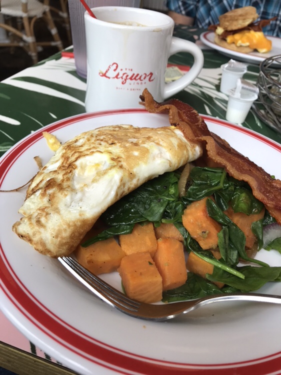 We were there for breakfast, so we focused on the breakfast menu, although I, honestly, likely would have focused on that part of the menu, regardless of the time of day we were eating there. My beloved chose their breakfast hash, which was comprised of super foods – sweet potatoes, spinach and caramelized onions, topped with soffrito, fried eggs and your choice of breakfast meat (including a veggie sausage option). She chose to top hers with Wright’s bacon (I might have gone with the Latin pork), but