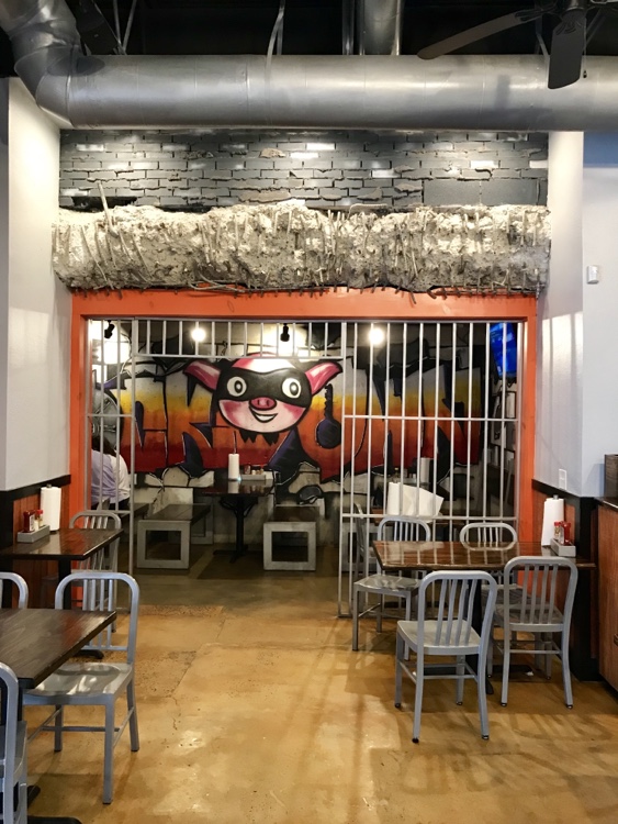Open since late 2016, I had to read the website to find the inspiration for the jail motif, but it involves a pig stealing his grandmother’s sauce recipes from inside a bank vault…