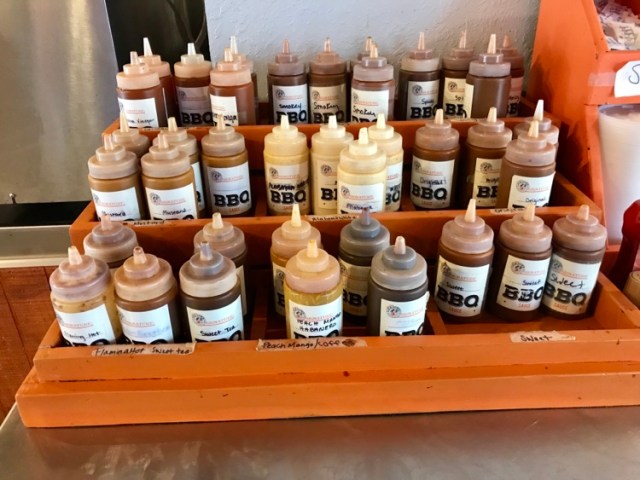 You may or not be able to tell from this photo, but there are at least 12 sauces.  And one of the servers told me that had two more in development.  My bride chose a deconstructed barbecue baked potato, with brisket.