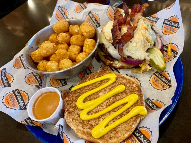 My beloved chose the 7 oz. beef patty, with bacon and a fried egg and tots. It was served with their bad daddy sauce – a mixture of mayo, barbecue sauce and chipotle.